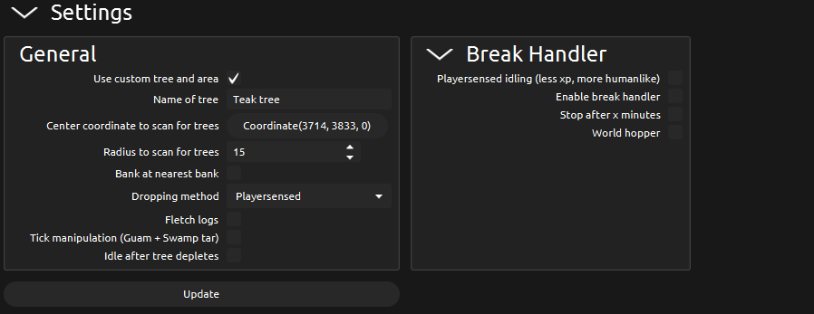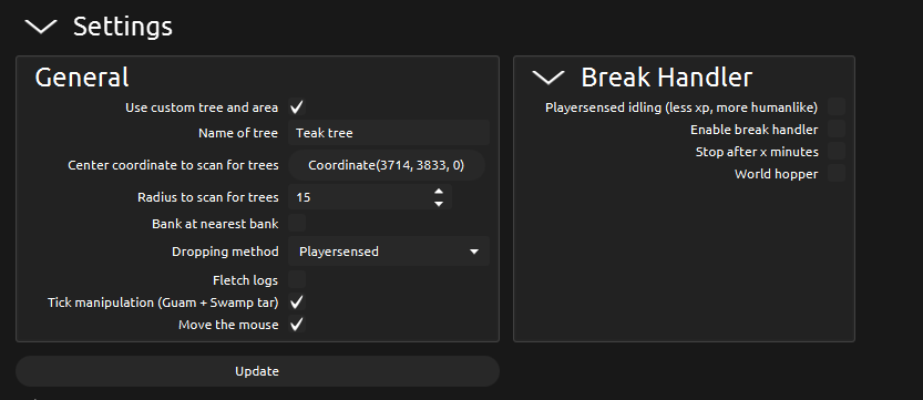 - Stand in the centre of where you would like the bot to scan for trees. Then click the center coordinate button setting